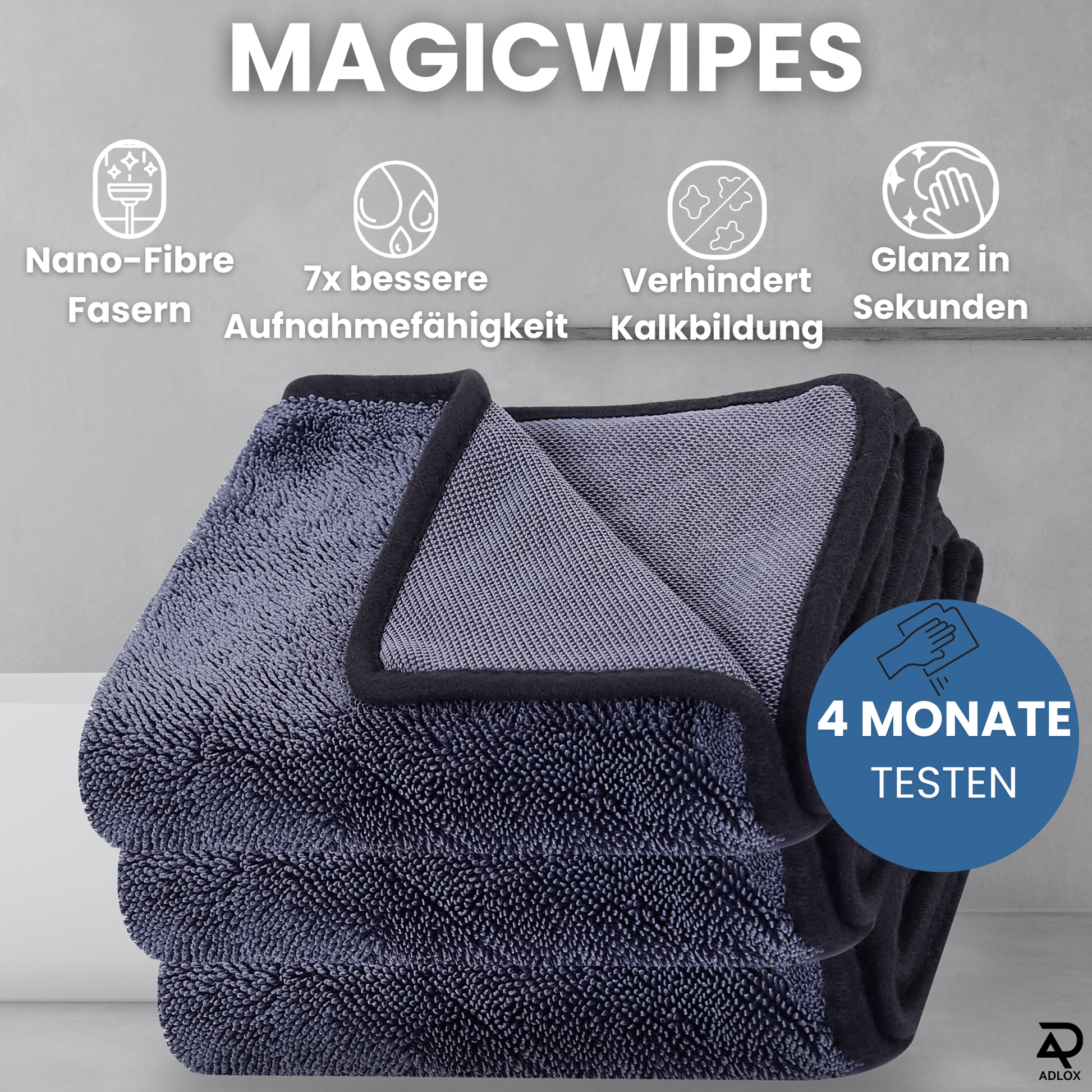 Dank fortschrittlicher NanoFibre®-Technologie sind MagicWipes siebenmal saugfähiger als herkömmliche Tücher. Sie erreichen jede Ecke und trocknen blitzschnell Oberflächen, sodass Ihr Bad sofort trocken und strahlend sauber ist – ohne den umständlichen Duschabzieher, der nur das Wasser verschiebt.