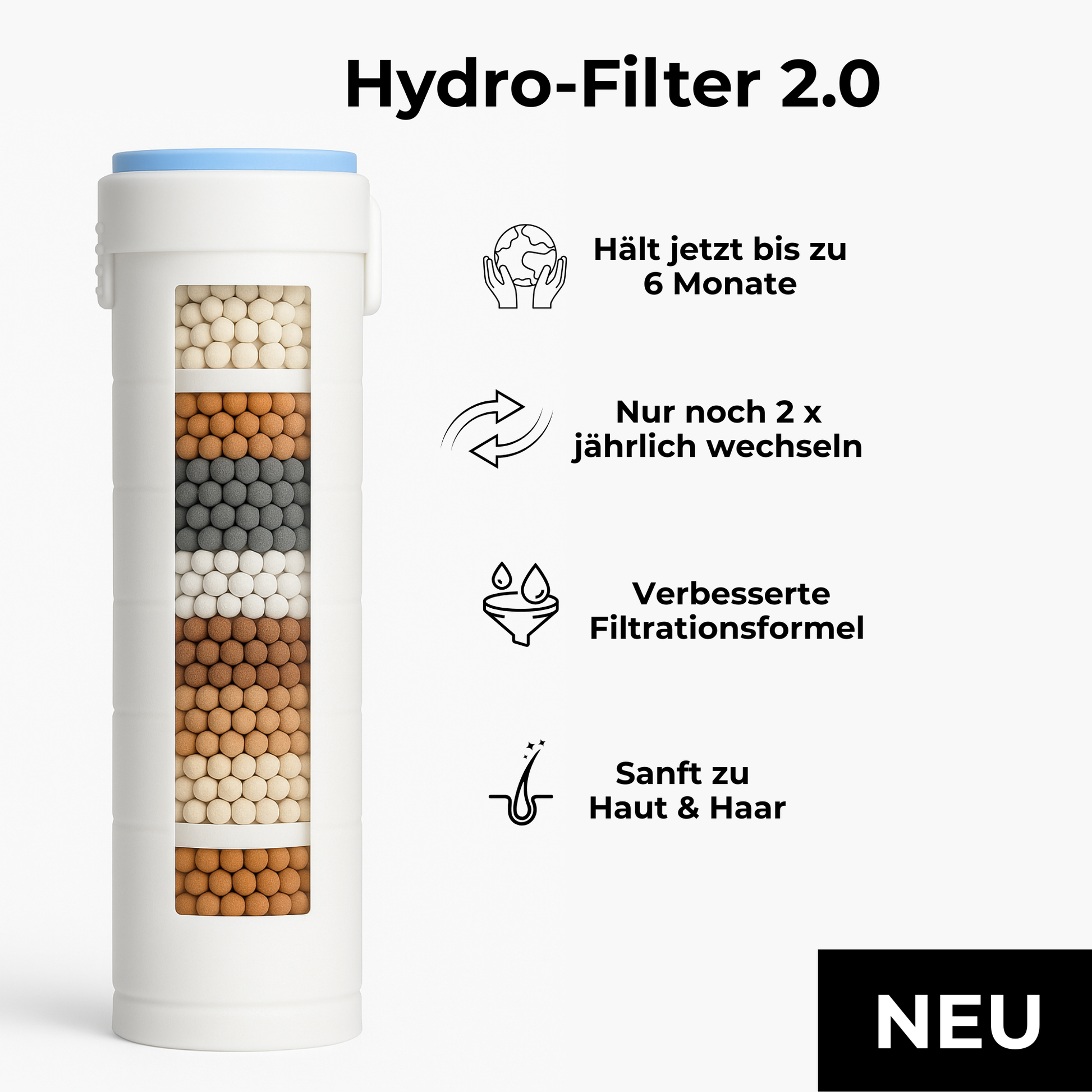 Der neue Hydro-Filter 2.0 wurde vollständig überarbeitet und enthält eine verbesserte Filtrationsformel mit stabilerer Perlenstruktur. Dadurch werden Kalk, Chlor und feine Schmutzpartikel noch effizienter aus dem Wasser entfernt – bei gleichbleibend hohem Wasserdruck.